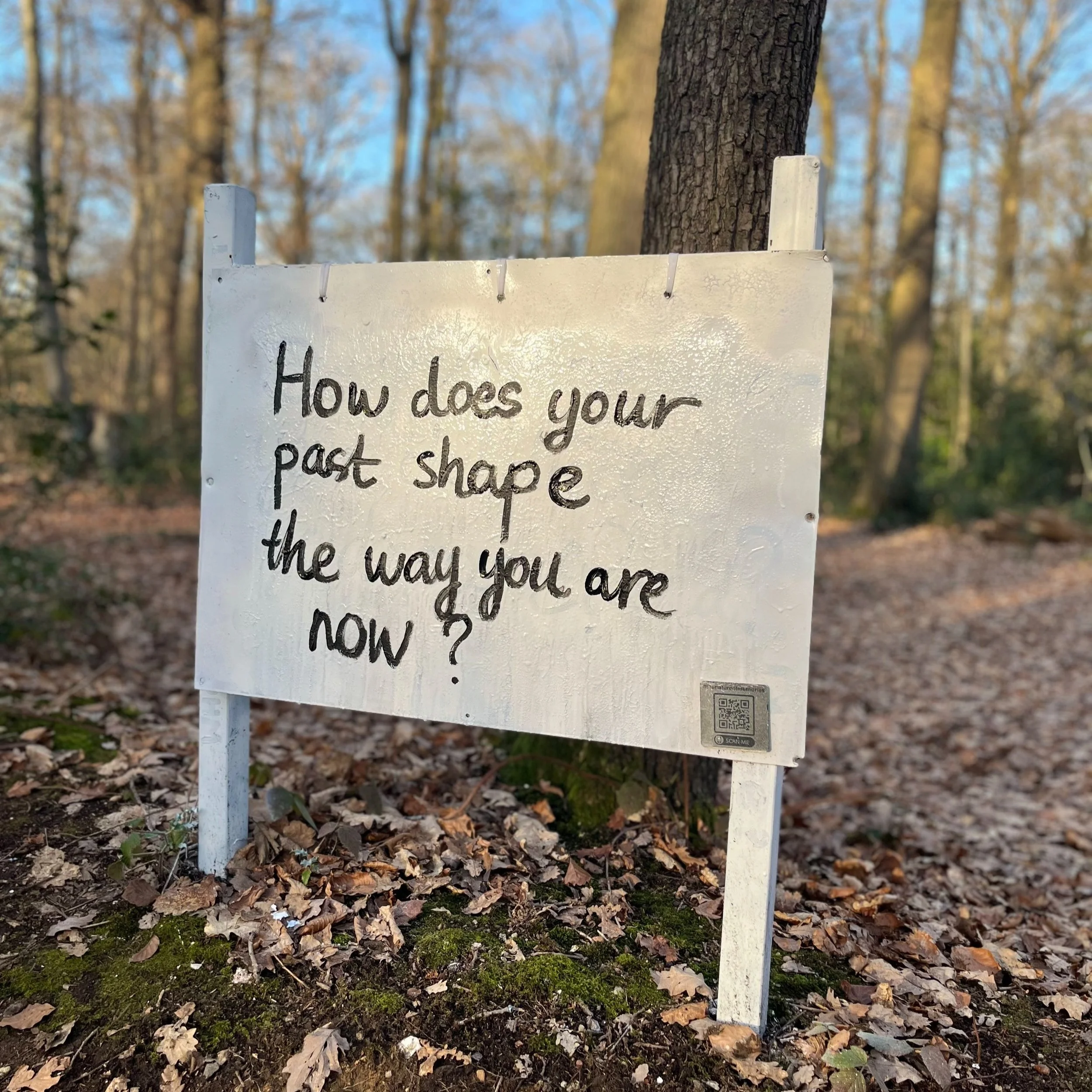 Every fortnight there will appear a quote / question on a sign board hiding among the local trees in the wood of Lye lane. Everyone who drives or walks past is prompted to connect with the message and interpret it in their own way.